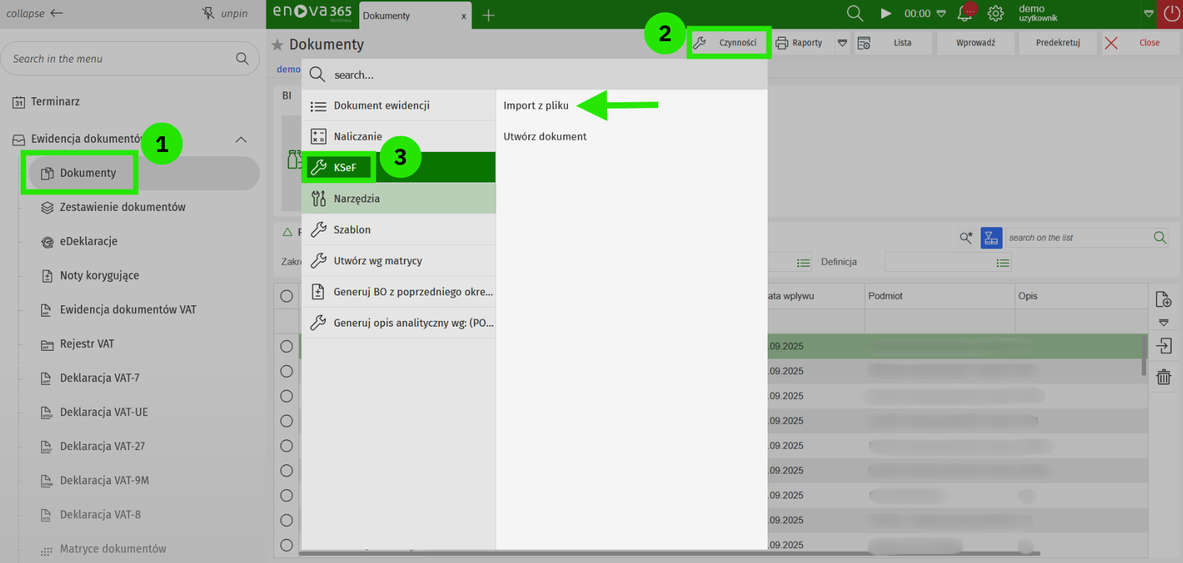 Go to enova365 > Ewidencja dokumentow > Dokumenty > Czynnosci > on Import z pliku to open a window where you can upload the CSV file.