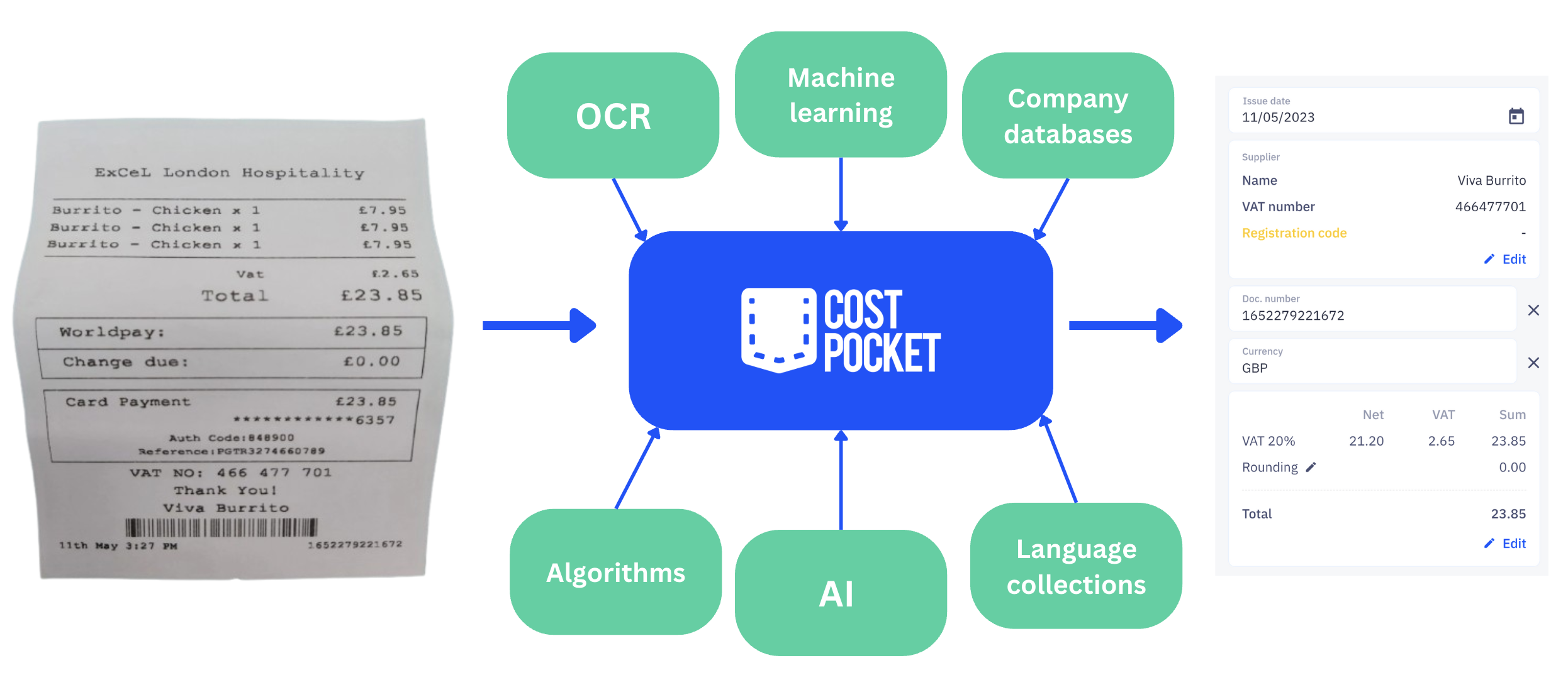 Extracting data reliably, accurately, and quickly from submitted PDF documents and pictures requires a lot of effort and specialized tools. At CostPocket, we’ve developed a robot that uses a variety of advanced technologies — including OCR (Optical Character Recognition), machine learning, algorithms, company databases, language-specific rules and templates, and AI — to process hundreds of thousands of documents every month.