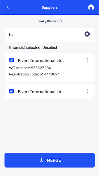 If the same supplier is digitized with different details (e.g. different addresses), multiple cards may be created. In that case, use the Merge button to combine them into a single supplier card.