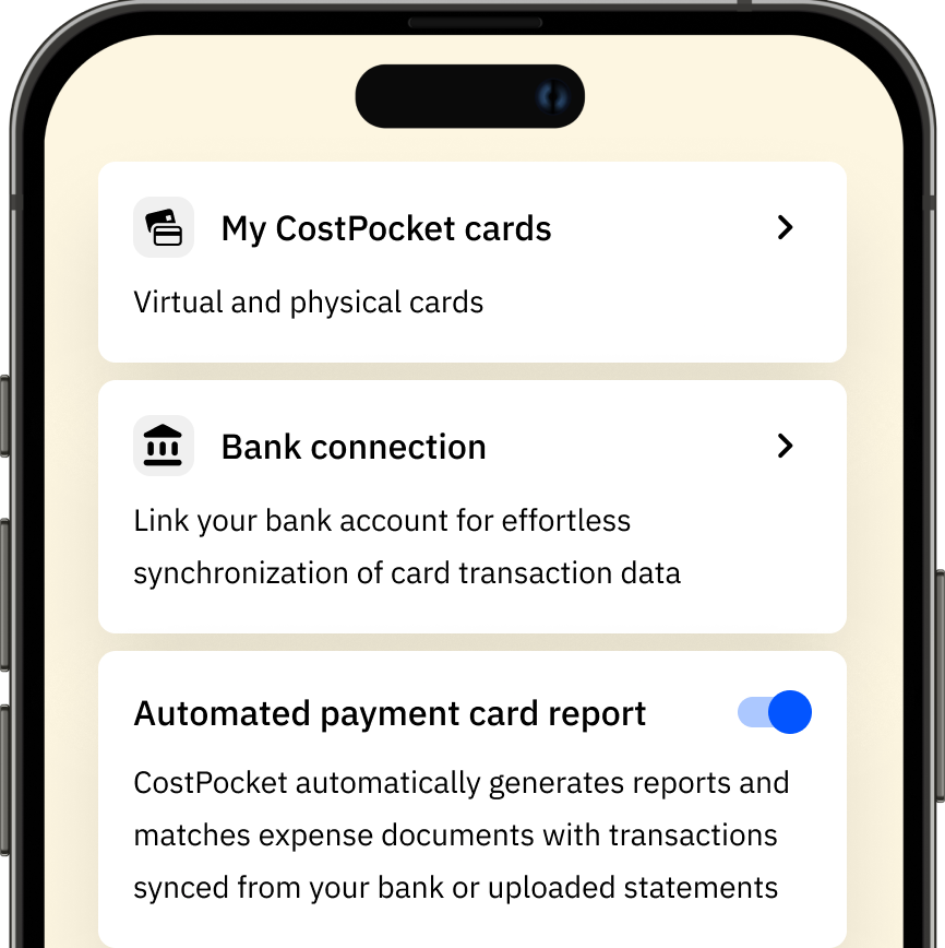 Project goal: we are developing a company payment card service that connects directly to CostPocket's document digitization and expense management software. This integration automates the accounting processes for business spending. Once launched, users will be able to issue and manage their payment cards directly within the CostPocket app, further optimizing business purchasing and expense reporting processes using our services.
