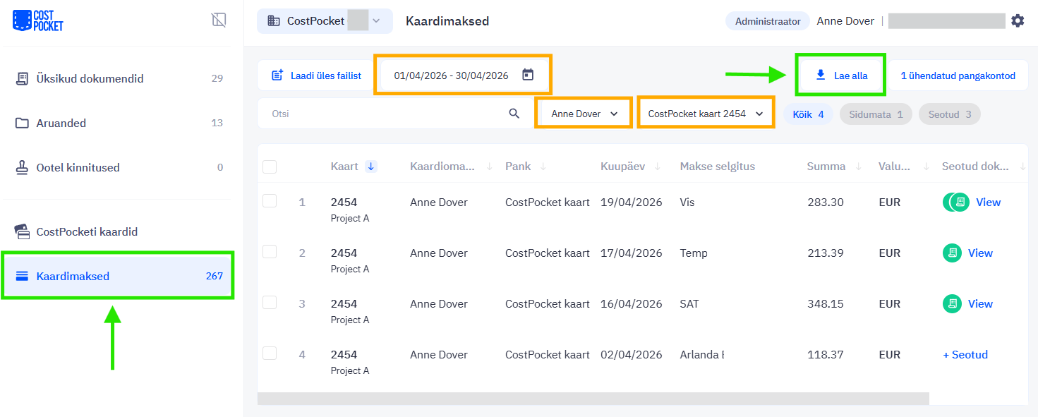 Kaarditehinguid saad eksportida minnes CostPocketi pilvekeskkonda (cloud.costpocket.com) > Kaardimaksed > vali vajalik kaardiomanik, kaart või periood > klõpsa nupul „Laadi alla”.
