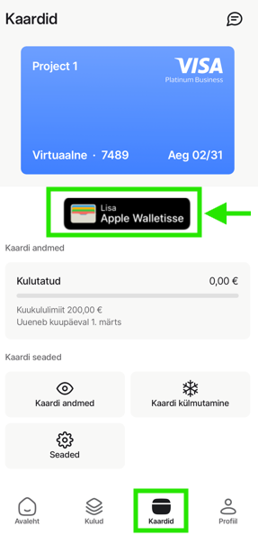 Kui kõik on valmis, näed oma kaardi andmeid Apple'i/Google'i rahakotis ning märkust "Lisatud Apple/Google Walletisse" ka Myntis.