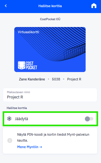 Jos olet kadottanut korttisi, voit jäädyttää sen kohdassa: CostPocket > Asetukset > CostPocket-kortit > klikkaa korttiasi > Jäädytä kortti. Jos löydät korttisi myöhemmin, voit helposti poistaa jäädytyksen samassa näkymässä.