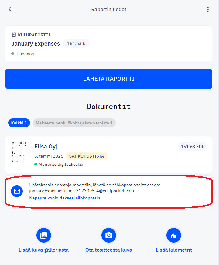 Voit lähettää tositteita sähköpostitse myös suoraan tietylle raportille. Kun raportti on luotu, sen oma sähköpostiosoite näkyy raportin sisällä.