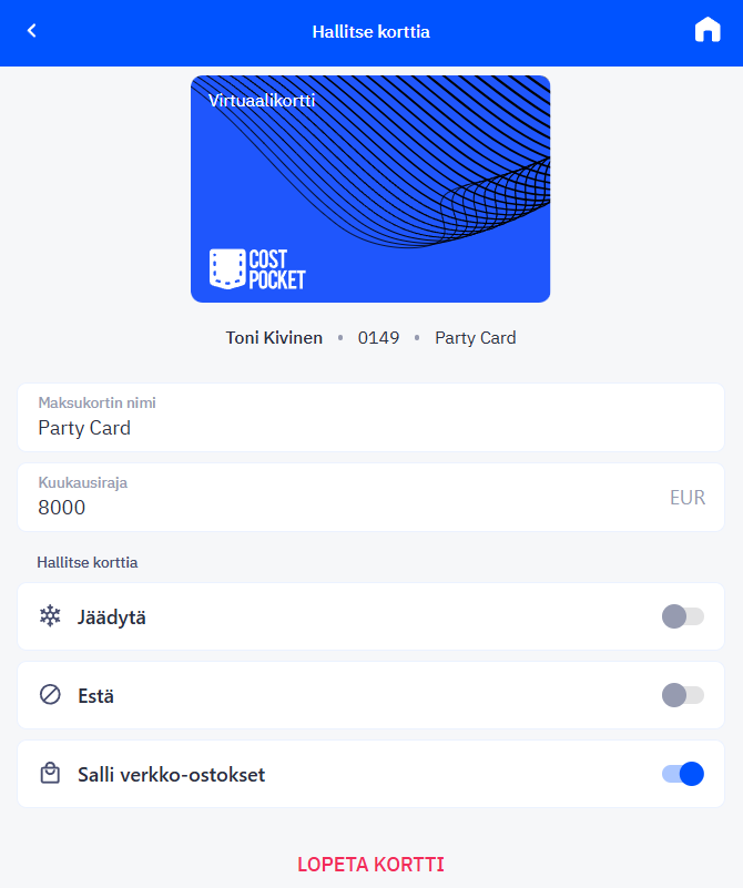 Hallinnoida korttejasi: CostPocket > Asetukset > CostPocket kortit > valitse korttisi.