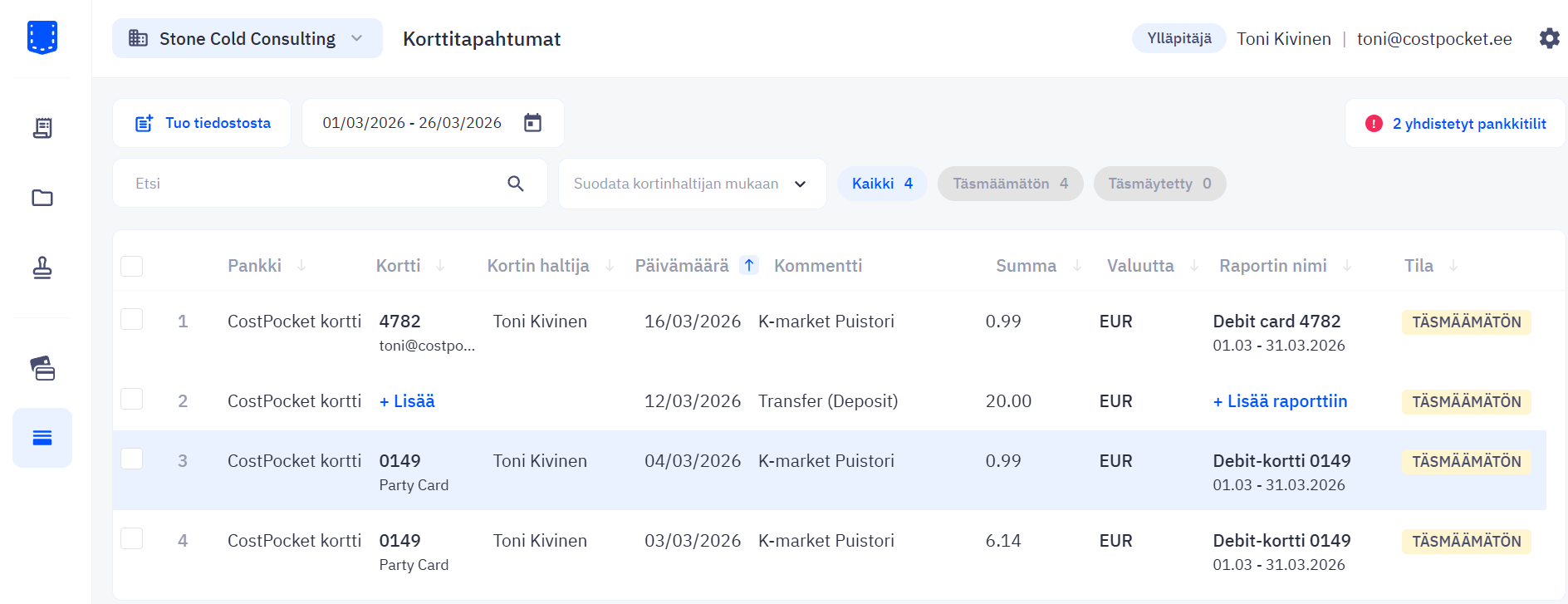 Kun olet avannut korttiraportin, näet kohdistattomat korttitransaktiot. Kun lataat tai otat kuvan alkuperäisestä kuitista, järjestelmä tekee automaattisesti täsmäytyksen korttitransaktion kanssa.