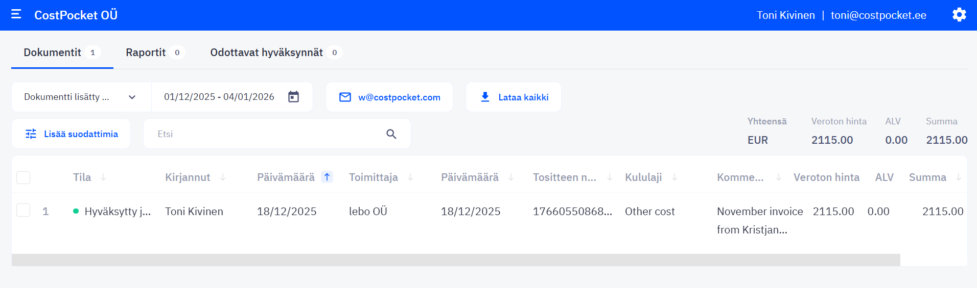 Huomioithan, että myös tavalliset käyttäjät voivat käyttää CostPocketin pilviympäristöä, mutta heidän näkymänsä rajoittuu vain niihin dokumentteihin, jotka he ovat itse lähettäneet.
