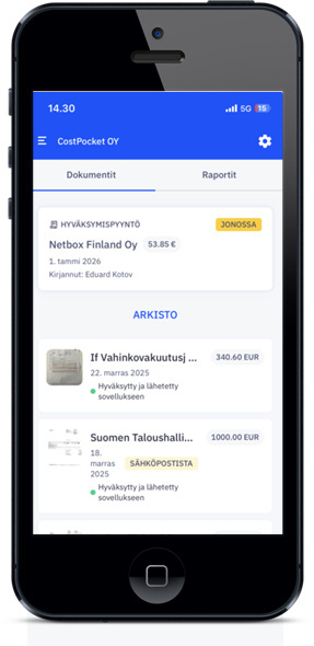 Mobiilisovelluksessa jokainen käyttäjä näkee vain ne dokumentit, jotka hän on itse ladannut tai jotka on liitetty hänen tiliinsä, kuten hyväksyntää odottavat tai jo hyväksytyt dokumentit.
