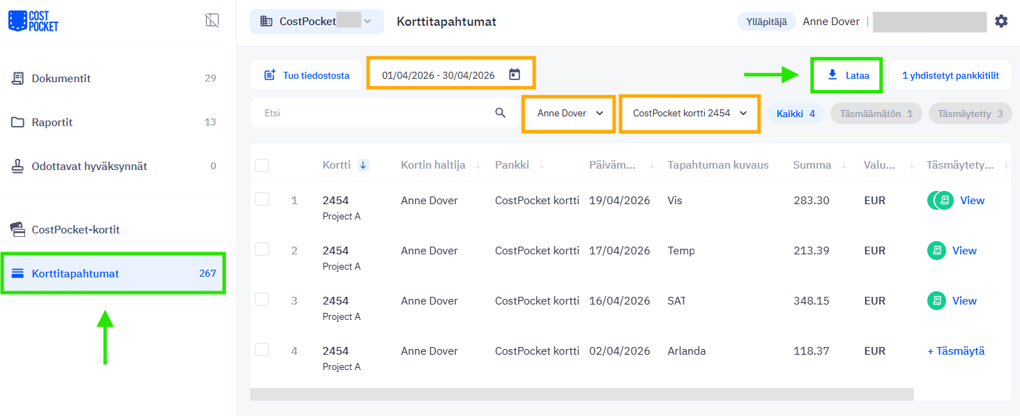 Voit viedä korttitapahtumia käyttämääsi kirjanpito-ohjlemaan seuraavasti: