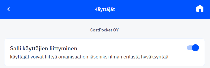 Voit liittyä yritykseen vain, jos tilin pääkäyttäjä on sallinut käyttäjien liittymisen. Tämä löytyy Asetukset > Käyttäjät.
