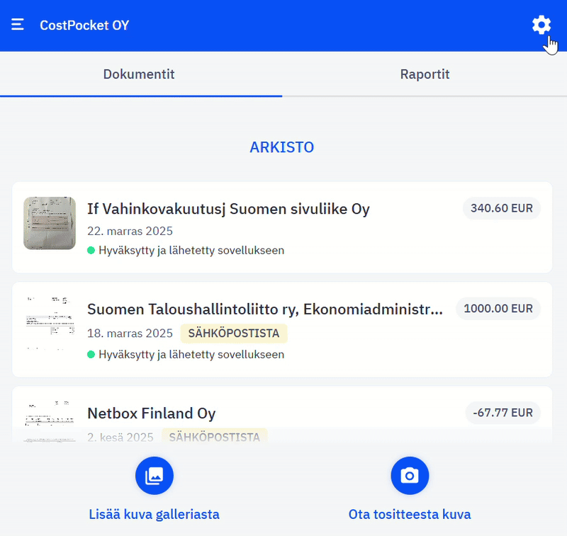 Jos haluat muuttaa tai lisätä laskun vastaanottajan CostPocket-palvelun laskuille, voit tehdä sen valitsemalla Asetukset > Laskutus.