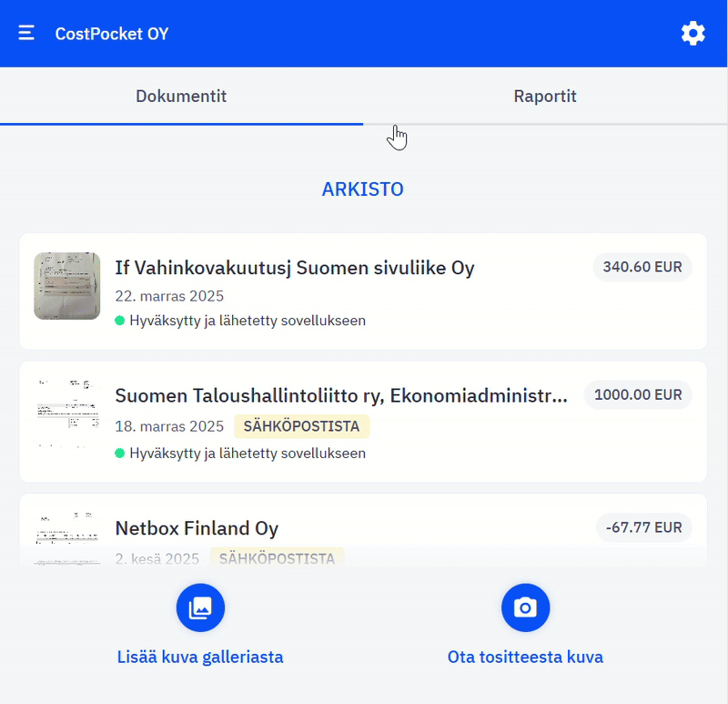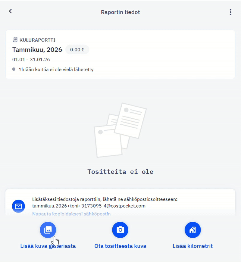 Kuluraportin avulla voit kerätä useita kuitteja ja laskuja yhteen raporttiin ja lähettää ne kerralla yksitellen lähettämisen sijaan.