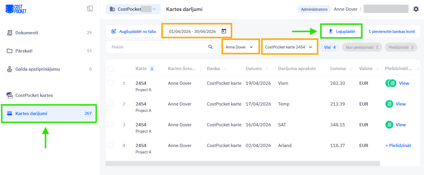 Varat eksportēt karšu darījumus, dodoties uz CostPocket mākoņvidi (cloud.costpocket.com) > Kartes maksājumi > ja nepieciešams, atlasiet konkrētu kartes turētāju, karti vai periodu > noklikšķiniet uz Lejupielādēt.