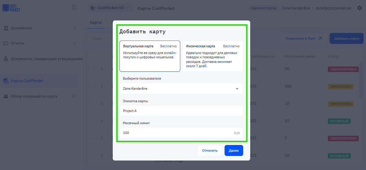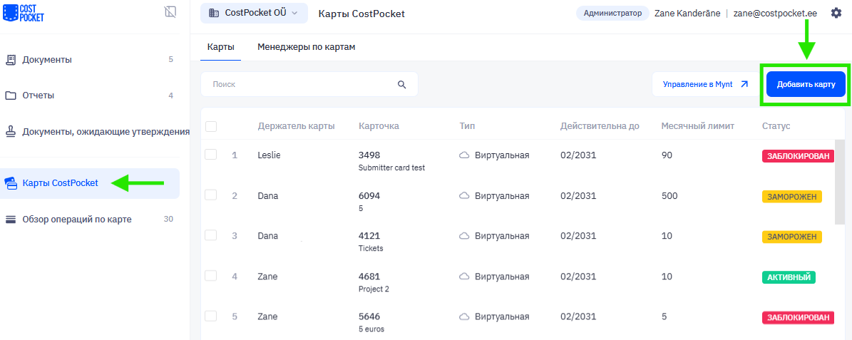 Менеджер карт может выдать карту в приложении CostPocket или в веб-интерфейсе (Cloud) в разделе «Карты CostPocket»: